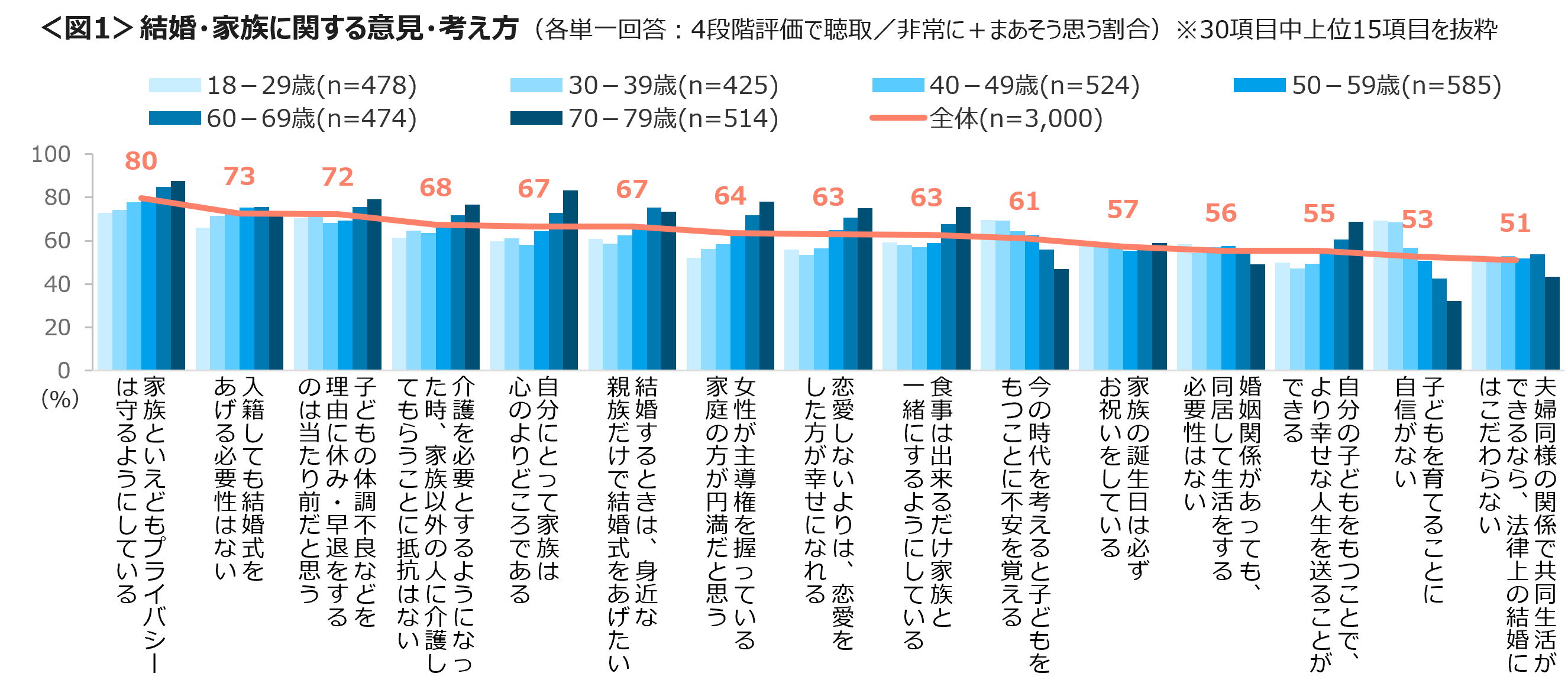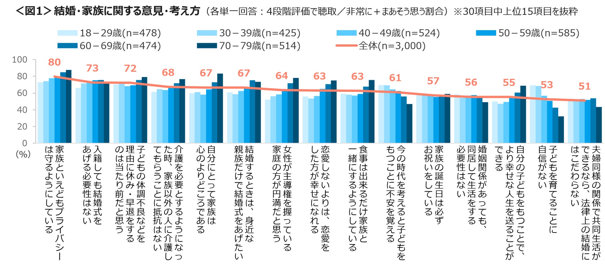 結婚・家族観についての意見・考え方を4段階で聴取した。非常に+まあそう思う割合は、「家族といえどもプライバシーは守る」80%、「入籍しても結婚式をあげる必要性はない」73%「子どもの体調不良などを理由に休み・早退をするのは当たり前」72%が上位にあがる。「今の時代を考えると子どもをもつことに不安を覚える」「子どもを育てることに自信がない」は、18~29歳、30代の割合が高い。<図1>