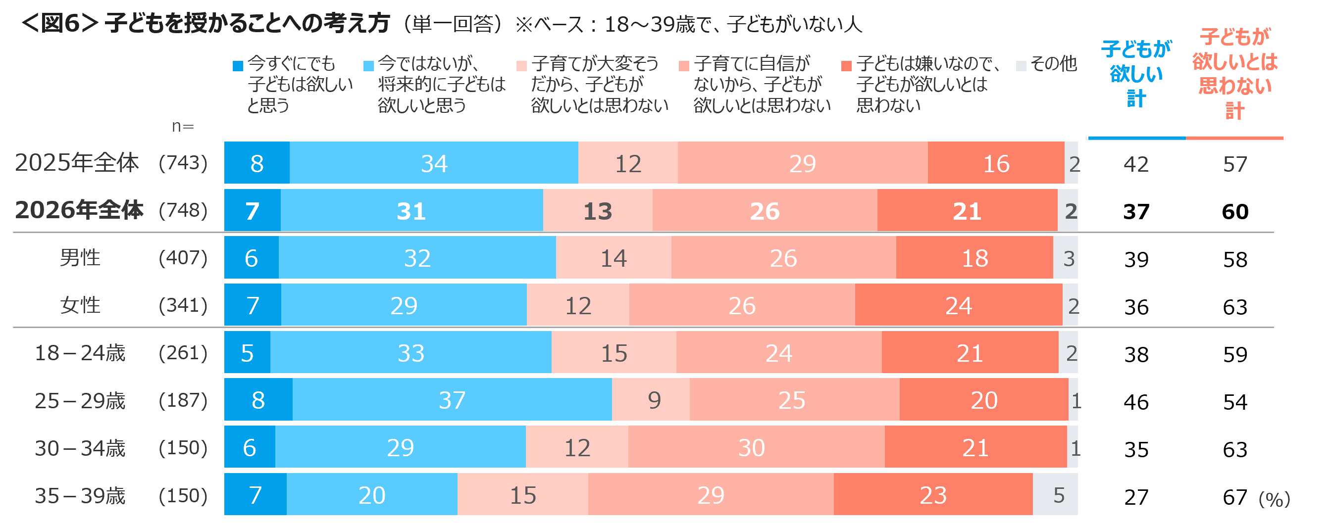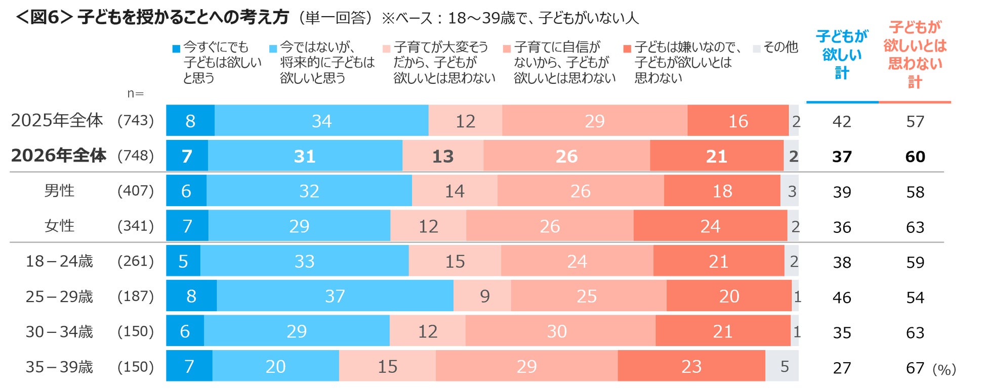 子どもを授かることについては、性別や年代別に見ても「子どもが欲しい」よりも「子どもが欲しいとは思わない」の方が上回る。昨年と比べ「子どもが欲しい」割合は低下している。<図6>