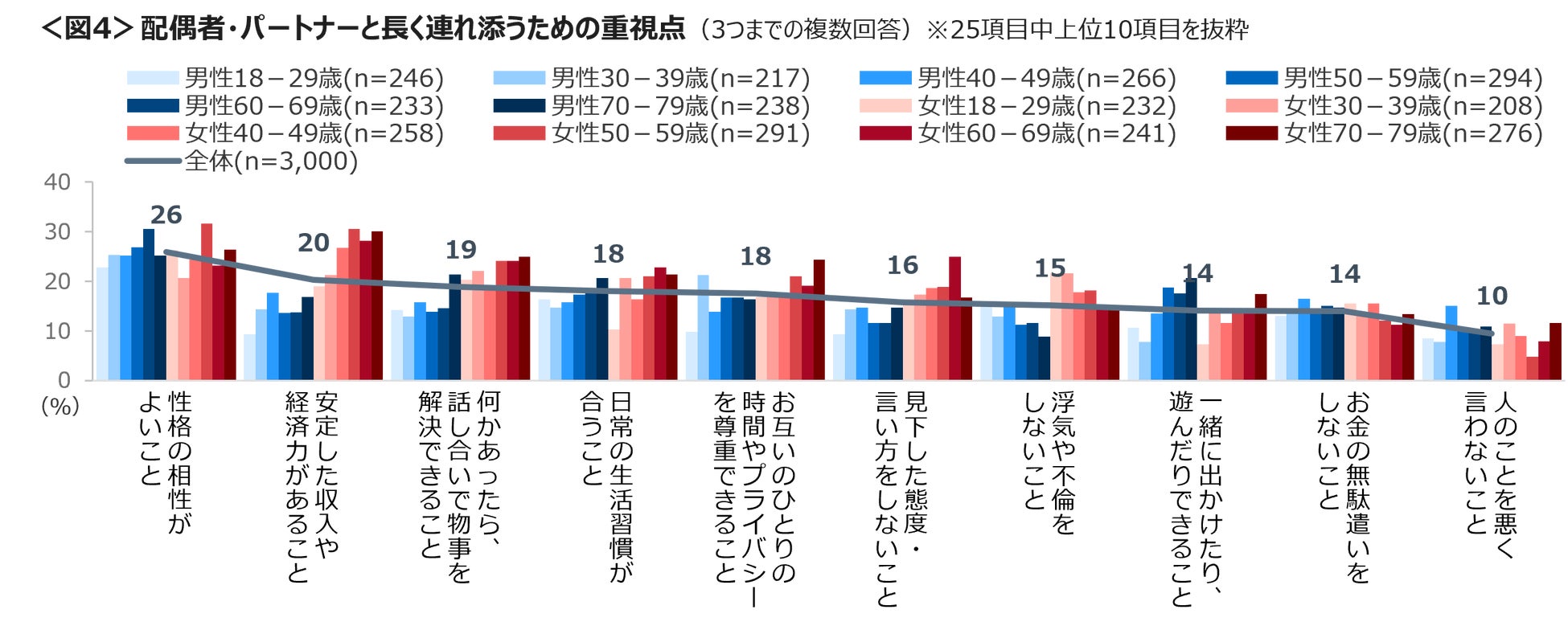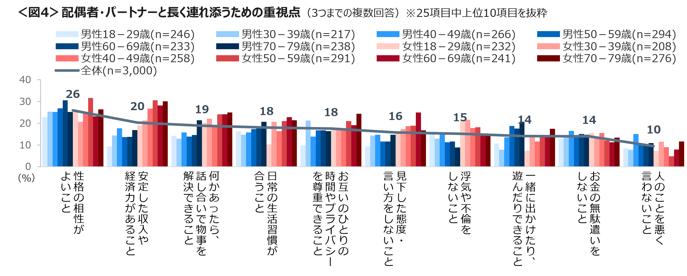 配偶者・パートナーと長く連れ添うためには「性格の相性がよい」「安定した収入や経済力」「何かあったら話し合いで物事を解決できる」が上位。収入や経済力と話し合いで解決の割合は、女性において多い。<図4>