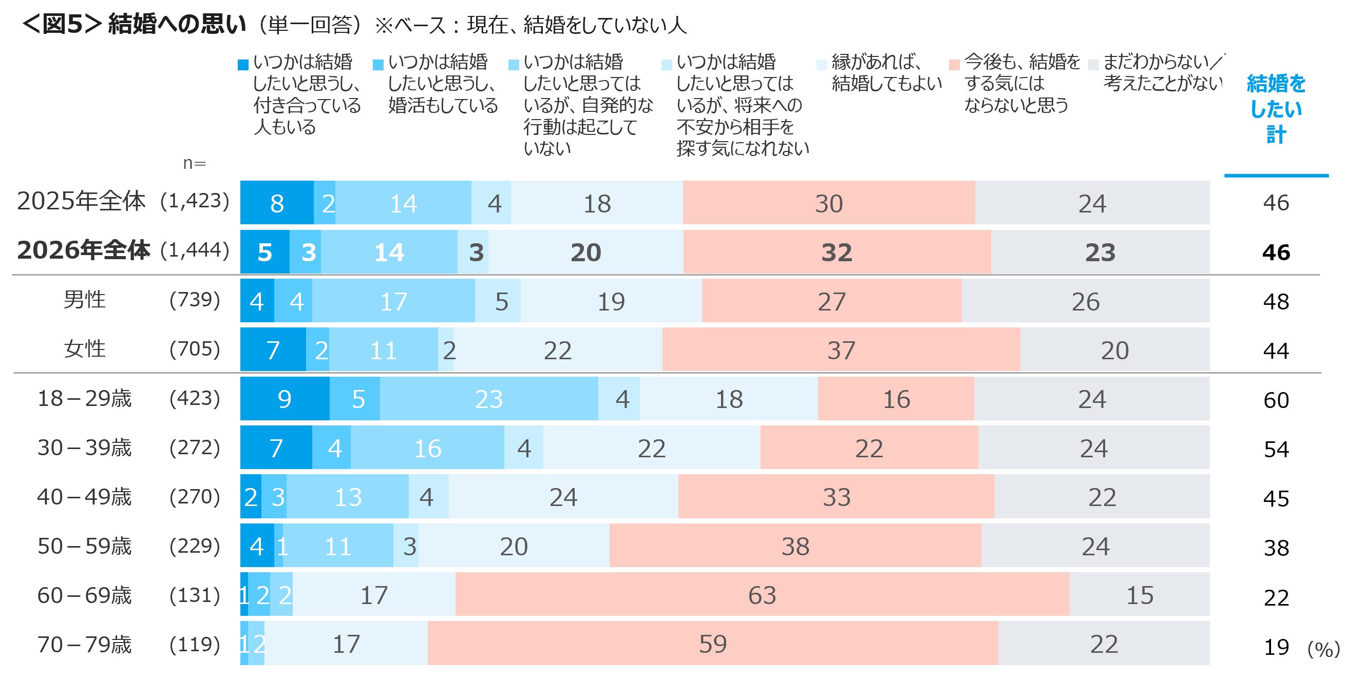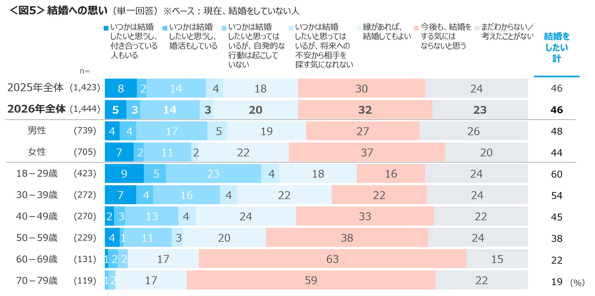 現在配偶者のいない人に対し結婚の意思を確認した。「結婚をしたい」人は46%、「今後も、結婚をする気にはならない」は32%と昨年の結果と変わりはない。18~29歳は「いつかは結婚したいが、自発的な行動は起こしていない」が23%を占めた。「結婚をしたい」意識は、18~29歳で60%、30代は54%。<図5>