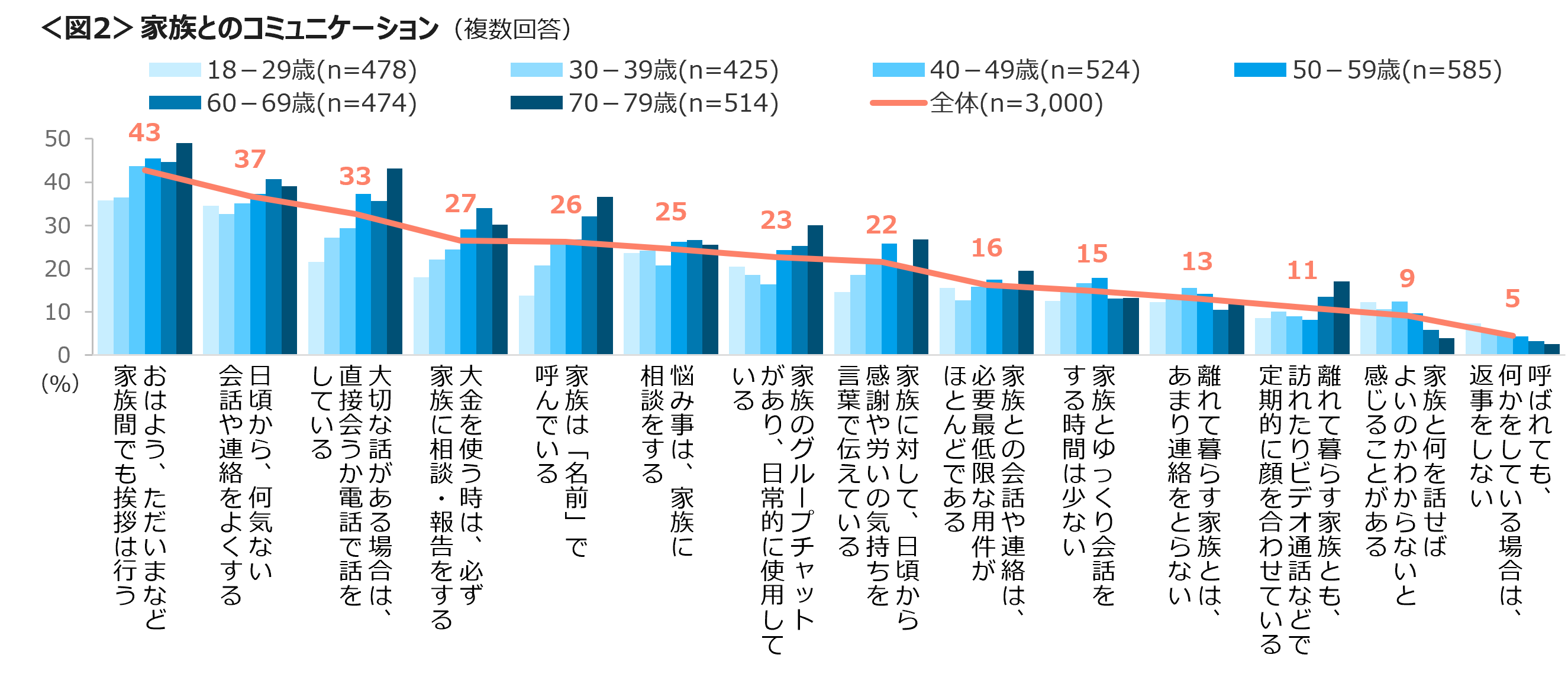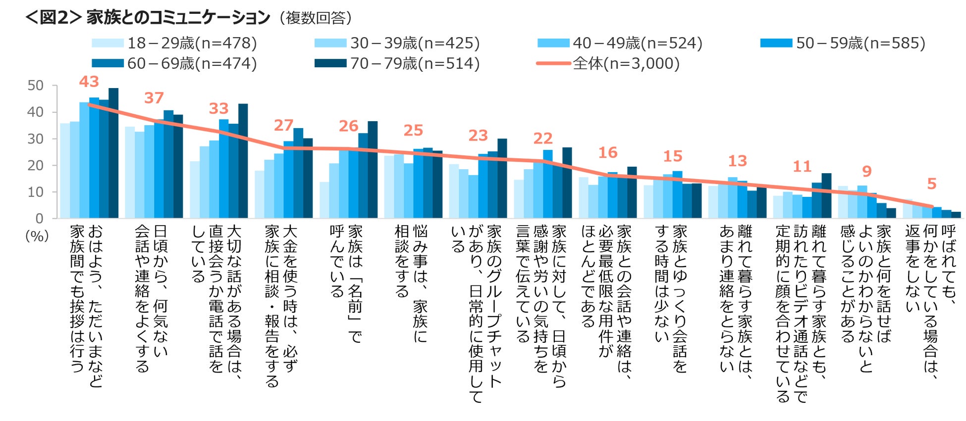 家族とのコミュニケーションは「家族間でも挨拶は行う」43%、「何気ない会話や連絡をよくする」「大切な話がある場合は、直接会うか電話で話をしている」が3割台。「家族のグループチャットを日常的に利用している」は70代が最も高い。<図2>