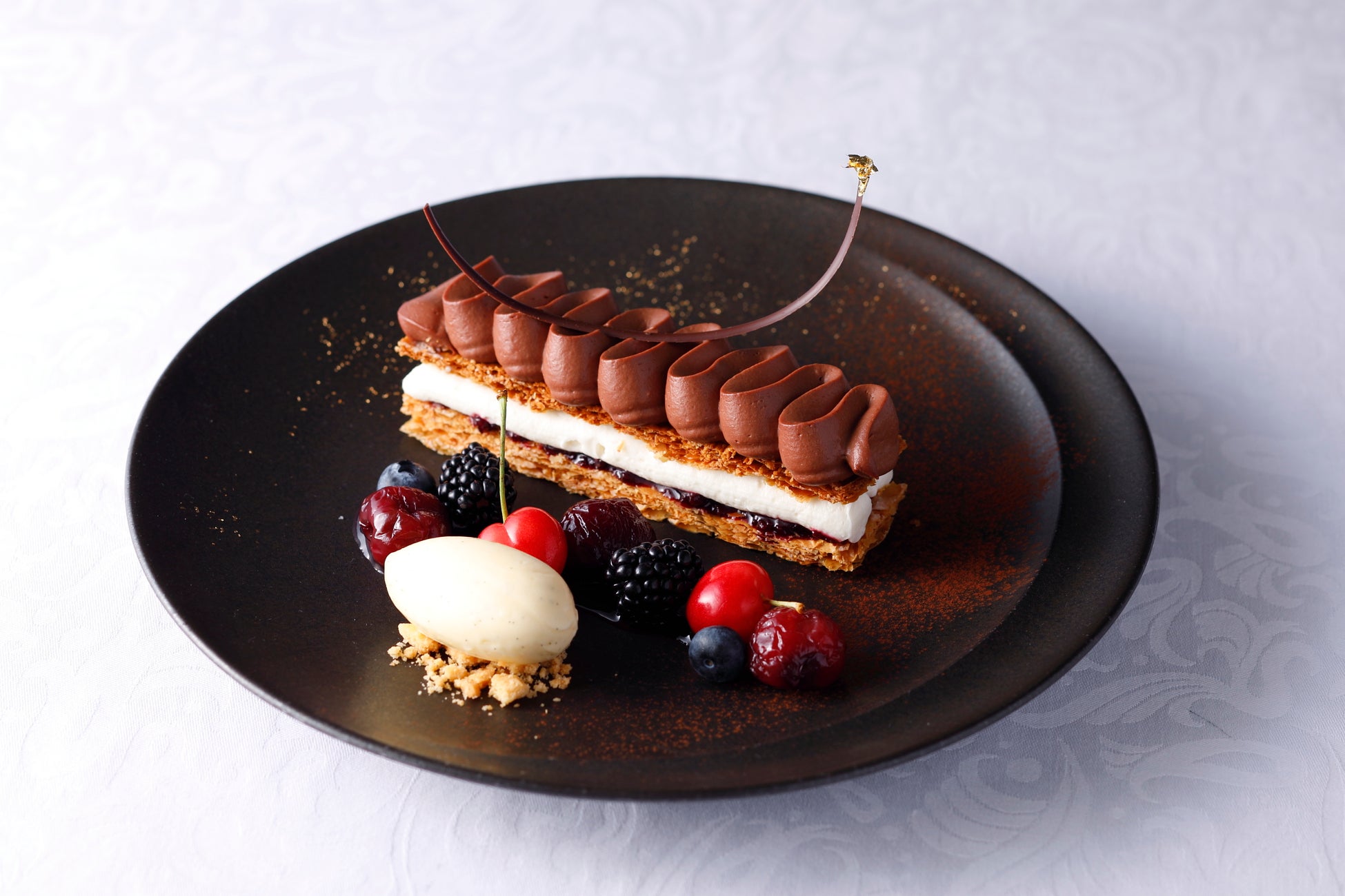 コクのあるダークチョコレートと優しい甘さのホワイトチョコレート、 2種類のクリームとアメリカンチェリーのジャムをミルフィーユ仕立てにしました。