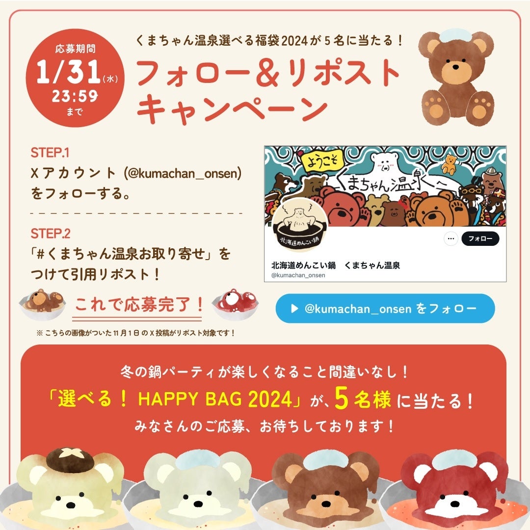 福袋セット販売の同期間中、くまちゃん温泉公式Xアカウントのフォロー&該当投稿のリポストで、抽選で5名様に限定HAPPY BAGをプレゼントいたします。
