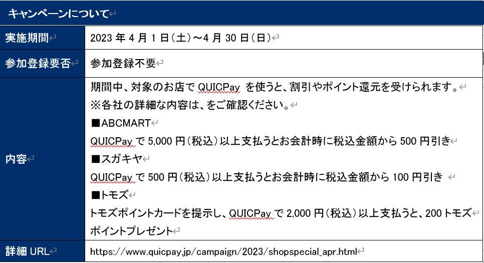 | 詳細URL | https://www.quicpay.jp/campaign/2023/shopspecial_apr.html |