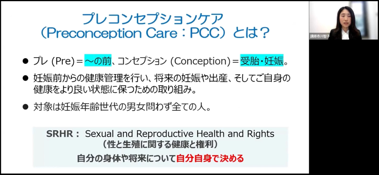 「プレコンセプションケア(プレコン)」の概念を解説と、日本医科大学付属病院における専門外来の取り組みについて、産婦人科学の医師より紹介されました。