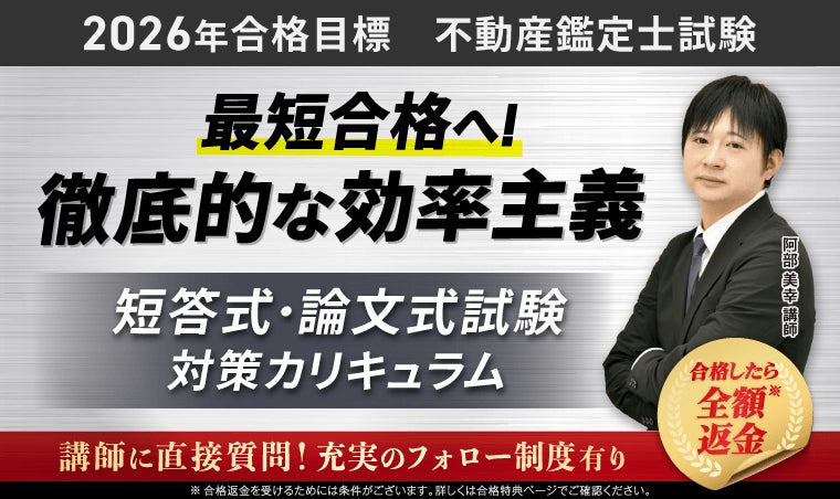 2026年合格目標 不動産鑑定士試験 短答式試験・論文式試験対策カリキュラムをお申込みいただいた方が2026年の不動産鑑定士試験に合格された場合、合格特典(全額返金+お祝い金3万円)がございます。