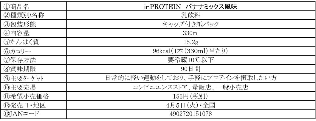 新商品「inPROTEIN バナナミックス風味」は、プロテインを15g配合したバナナミックス風味の乳飲料です。脂肪ゼロですっきりとした味わいでゴクゴク飲め、運動後などのしっかりプロテインをチャージしたい時にぴったりです。また、キャップ付き容器で、いつでも、手軽にプロテインをチャージできます。
