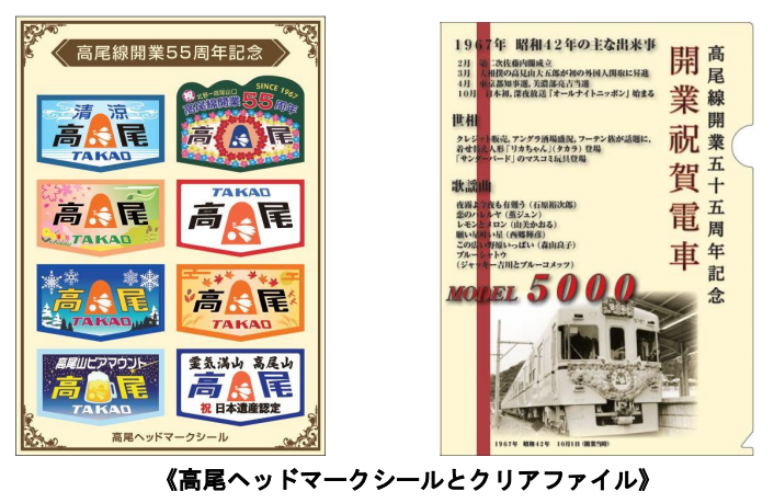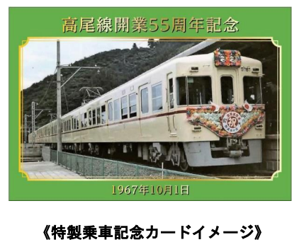 本企画に合わせ、10月1日(土)からは高尾線開業55周年記念ヘッドマーク付き列車を運行します(終了日は12月28日予定)。さらに、10月29日(土)のMt.TAKAO号1・3・5号にご乗車いただいた方に特製乗車記念カードを進呈します。