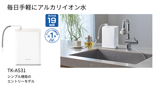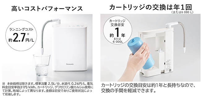 パナソニック のアルカリイオン整水器TK-AS31なら、1Lあたりのランニングコストは約2.7円(※)。カートリッジ交換の目安も約1年または6000Lなので、お茶やコーヒーはもちろんのこと、料理にも気軽に使えます。
