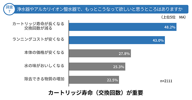 既に浄水器やアルカリイオン整水器を利用している方に「もっとこうなってほしいと思うところは」と質問したところ、半数近くの方が、カートリッジの交換回数が減ることやランニングコストが安くなることを望んでいます。