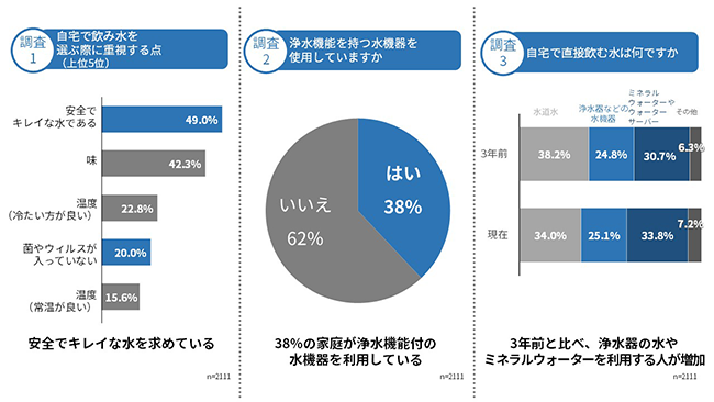 今回の調査では、約半数の方が自宅で飲み水を選ぶ際は「安全性」を重視していて、浄水器や整水器等の水関連機器を利用している人は 38%という結果がでました。また3年前と比べて、直接飲む水では浄水器などを使った水やミネラルウォーターを利用する人が増えていることが分かりました。