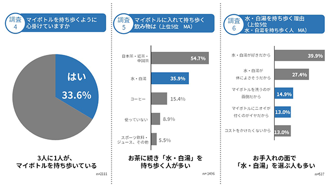 今調査では、3人に1人がマイボトルを持ち歩いているという結果がでました。またマイボトルの中身は「お茶」に次いで「水・白湯」が多いことが分かりました。
