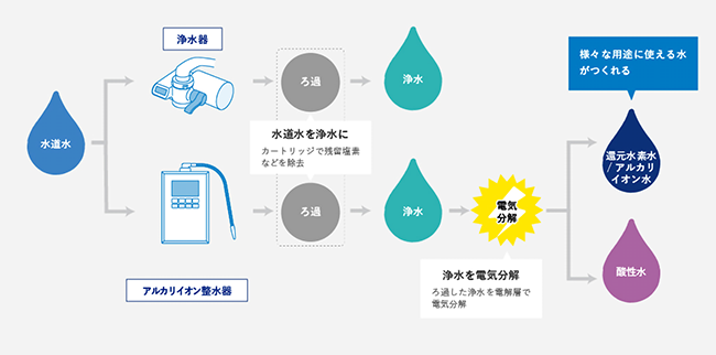 アルカリイオン整水器なら浄水した水を電気分解して、様々な用途に使える水がつくれる!