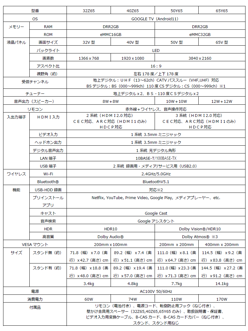 型番/画面サイズ:32Z65/32V型、40Z65/40V型、50Y65/50V型、65Y65/65V型