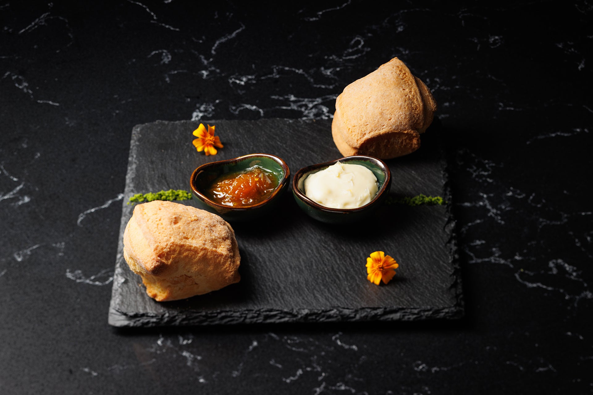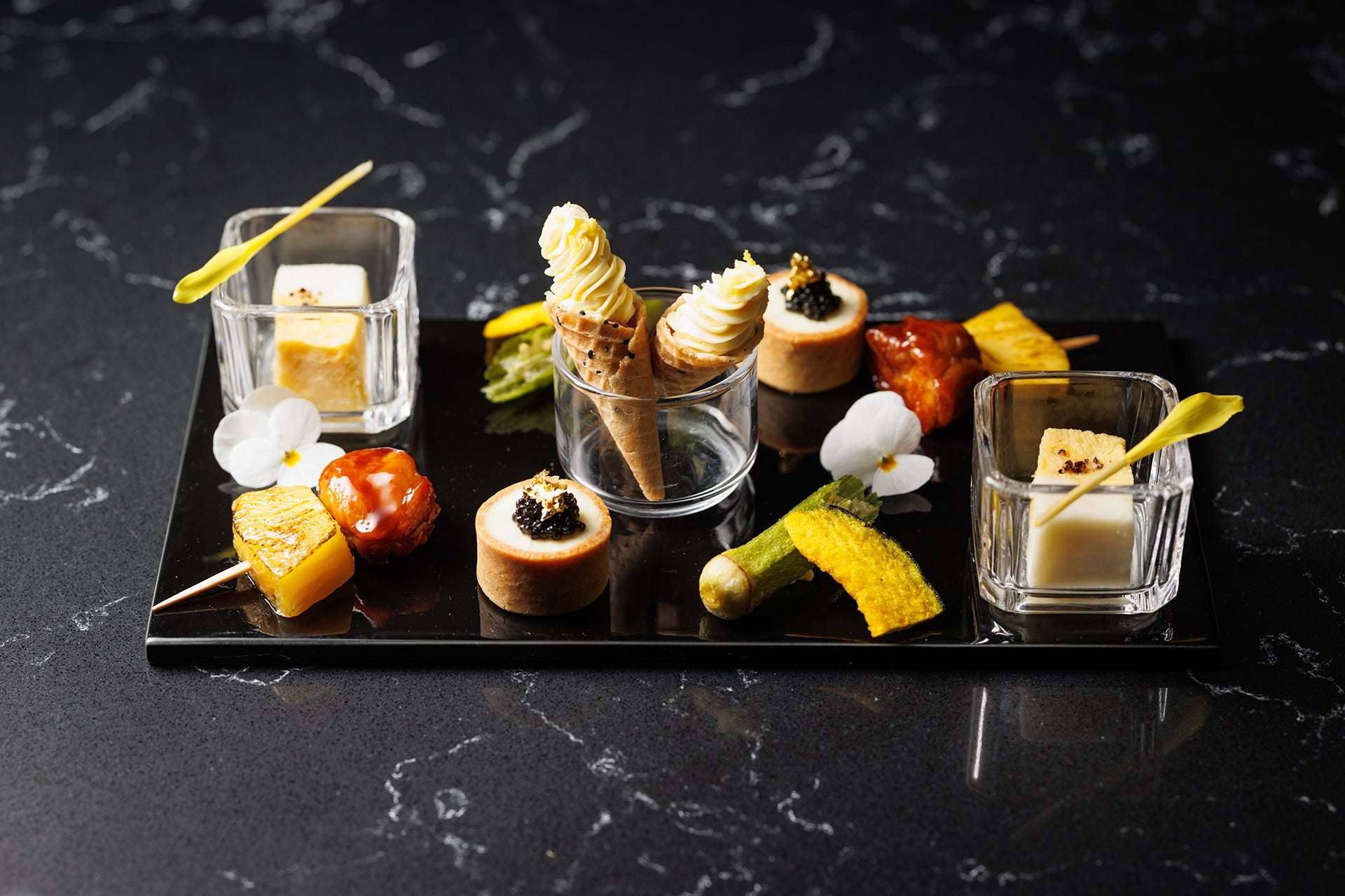 夏らしい食材をフレンチの技法とエッセンスで仕上げたメニューがスタンドを鮮やかに飾ります。「生ハムとクリームチーズのソフトクリーム見立て」は、蜂蜜とレモンがアクセントの甘くてソルティな一品。スパークリングワインのジュレが爽快感のある「パイナップルとスパークリングワインのガスパチョ」、バーベキューのイメージで仕上げた「鶏もも肉とパイナップルのブロシェット」等、遊び心もある多彩な味わいのセイボリーが並びます。大阪の街並みが一望できる開放感のあるロケーションで、午後のひとときをゆったりとお過ごしください。