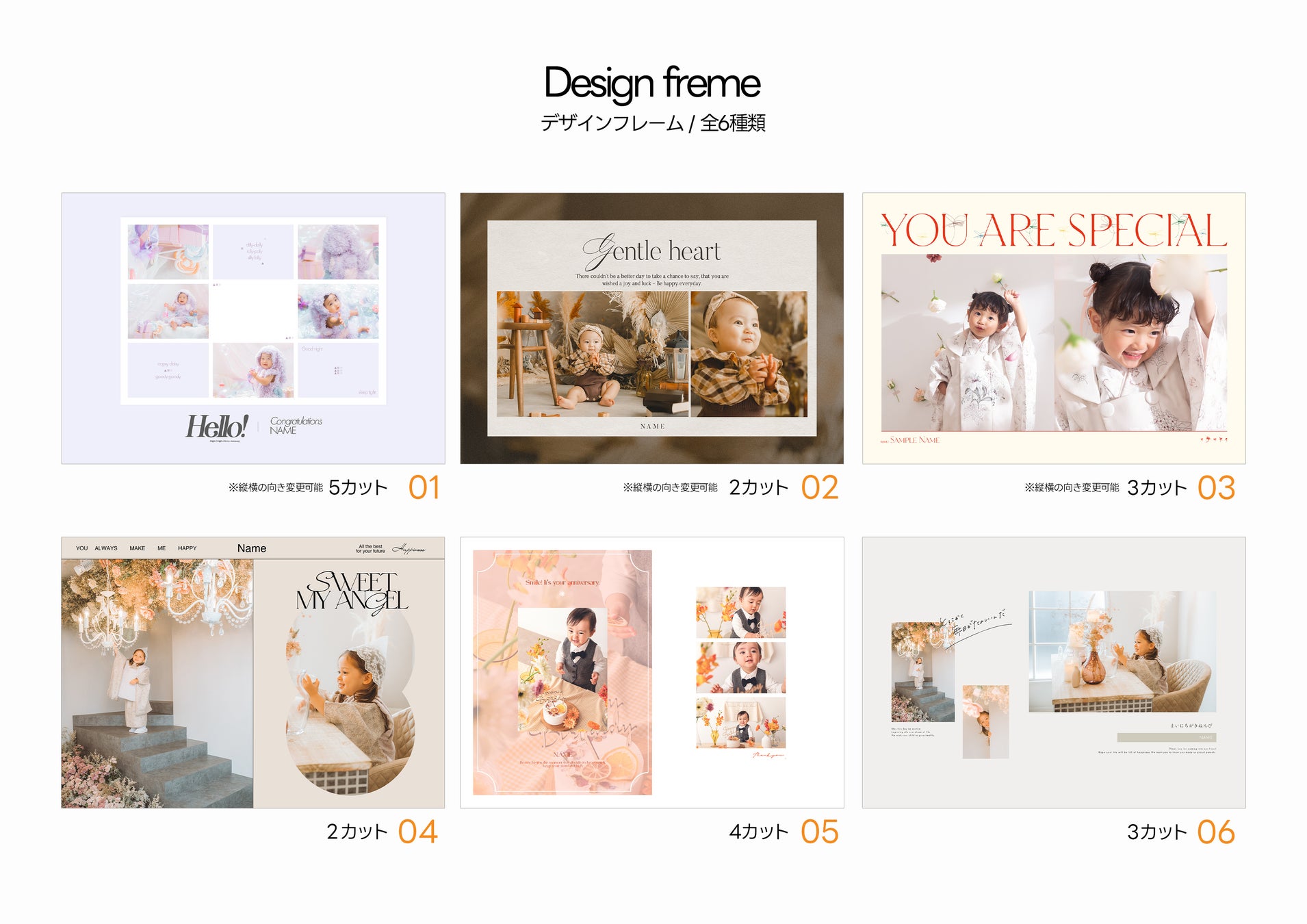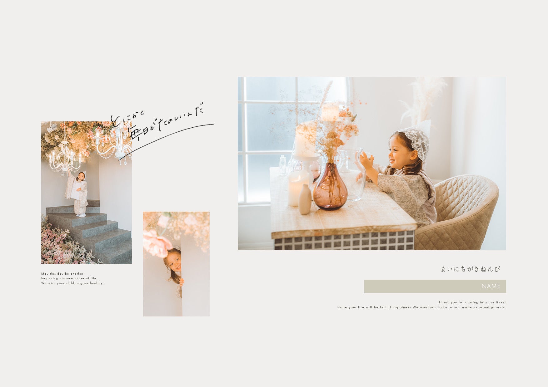 大切なご記念、お子様の成長をお祝いするとともに、仕上がった写真をより素敵に残せるよう、バリエーション豊かなデザインを提案いたします。
