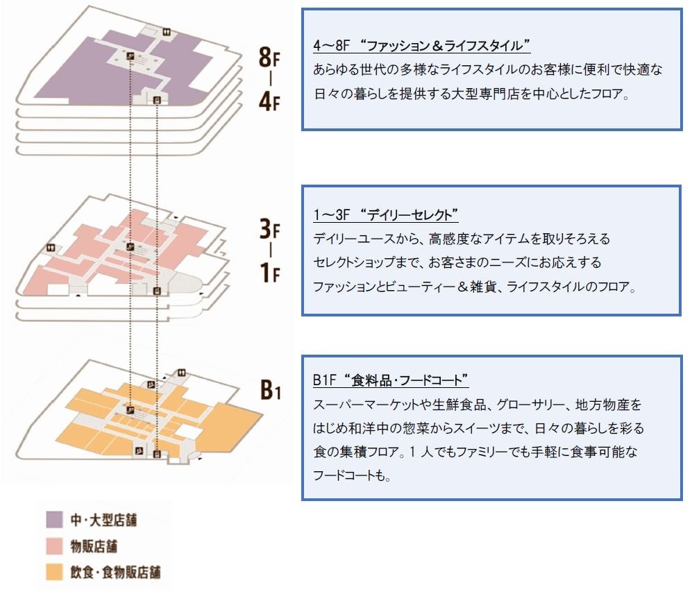 「街の賑わい」と「日常生活の彩り」をコンセプトに、スーパーや生活雑貨店などを核として、ファッションやレストラン、地域に必要とされる医療やサービス機能などを集積し、利便性の高い商業施設として、都市近郊生活者に洗練されたライフスタイルの提供を目指しています。