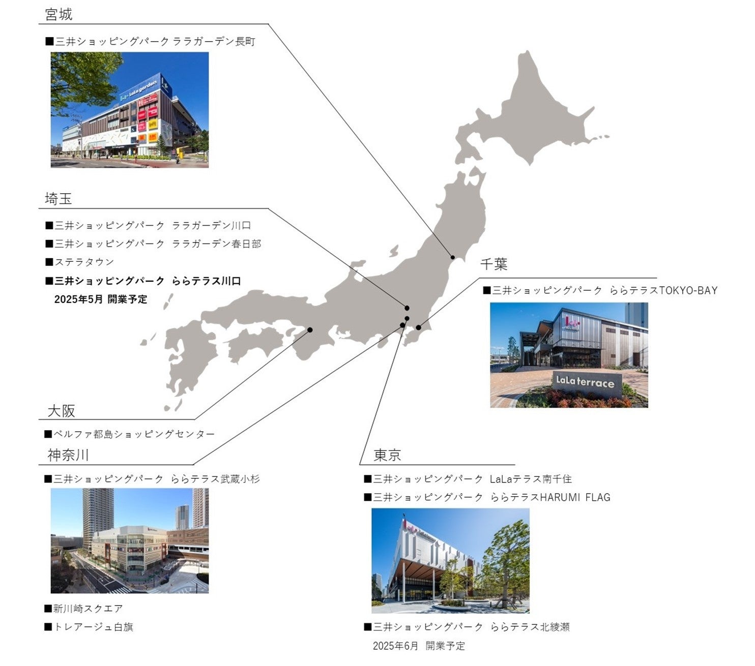 現在、「三井ショッピングパークLaLaテラス南千住」(東京都荒川区、2004年開業)、「三井ショッピングパーク ららテラス武蔵小杉」(神奈川県川崎市、2014年開業)、「三井ショッピングパーク ららテラスTOKYO-BAY」(千葉県船橋市、2023年開業)、「三井ショッピングパーク ららテラスHARUMI FLAG」(東京都中央区、2024年開業)を運営しているほか、「三井ショッピングパーク ららテラス北綾瀬」(東京都足立区、2025 年6月開業予定)の開発を推進中です。