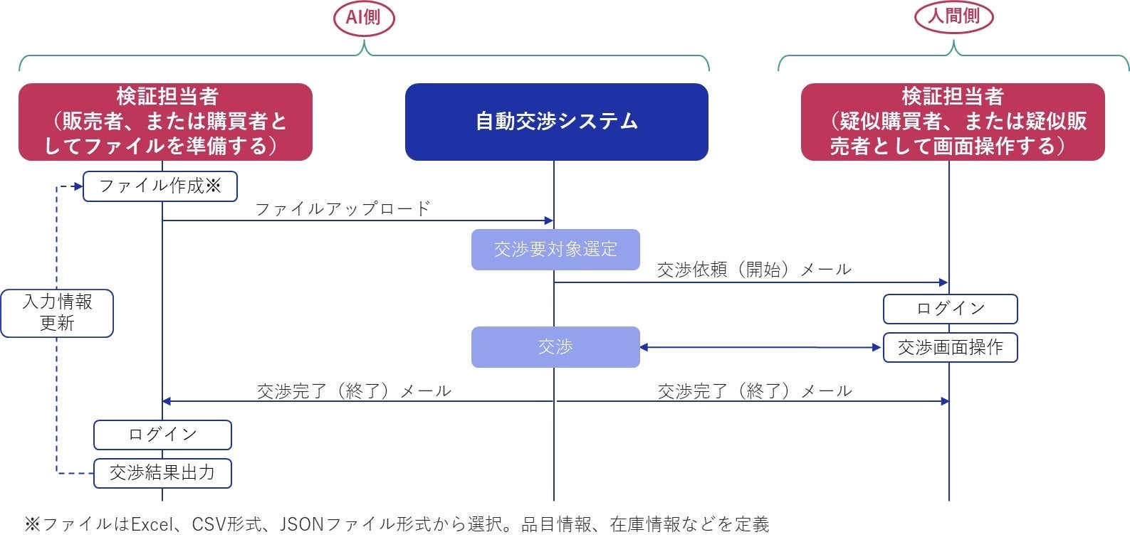 今回の検証においては、実システムと自動交渉AIをシステム連携しましたが、検証時の実システムとの連携は自動交渉AIの導入を検討するお客様の負荷が大きいため、検証用ファイル(品目情報などを定義するファイルでExcelファイルやCSVファイル)を作成するだけで、自動交渉の検証ができる環境を構築しています。2025年1月以降、お客様に簡易検証を実施できるよう準備を進めており、販売側が人で購買側に自動交渉AIを適用するだけでなく、購買側が人で販売側に自動交渉AIを適用するケースにも対応可能予定です。