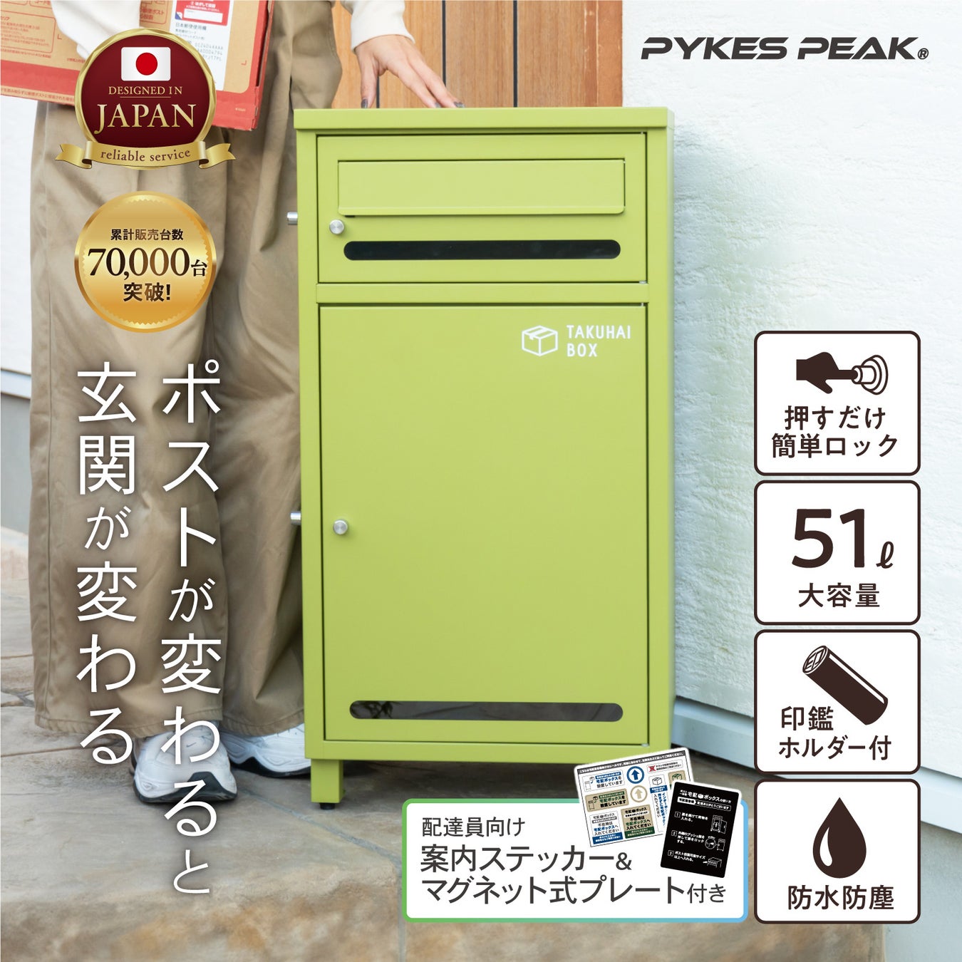 さらに、上下共通のシリンダーワンプッシュ錠でセキュリティ性を確保しつつ、底部のプロテクトクッションが荷物を衝撃から守ります。郵便ポストとしても機能し、A4サイズ以上のメール便にも対応。どんな玄関にもなじむ6カラー展開で、デザイン性も抜群です。