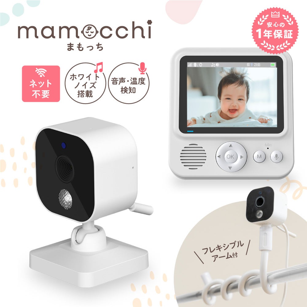 赤ちゃんの様子を手元の専用モニターでしっかり確認できるベビーモニター「まもっち」。カメラはHD720P対応で、表情や小さな動きまで映し出します。暗視モード(ナイトビジョン)を搭載しているため、照明を落とした寝室でも赤ちゃんの寝顔をクリアに確認可能。寝返りの瞬間や泣き出す前の動きもキャッチできるベビーカメラです。