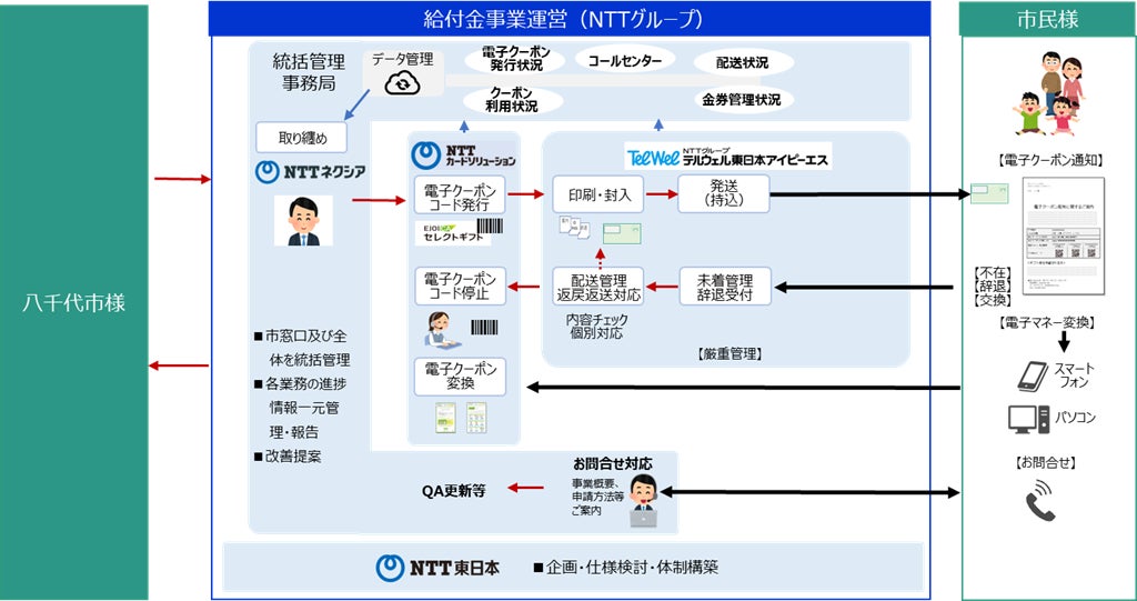 本業務において、NTTネクシア、NTTカードソリューション、テルウェル東日本IPS、NTT東日本は、入札から実施まで約1か月での運用を開始、システムの構築・運用から各種通知の企画・作成・発送・管理、市民サポートまでをトータルで提供。迅速且つ正確な給付に貢献してまいります。