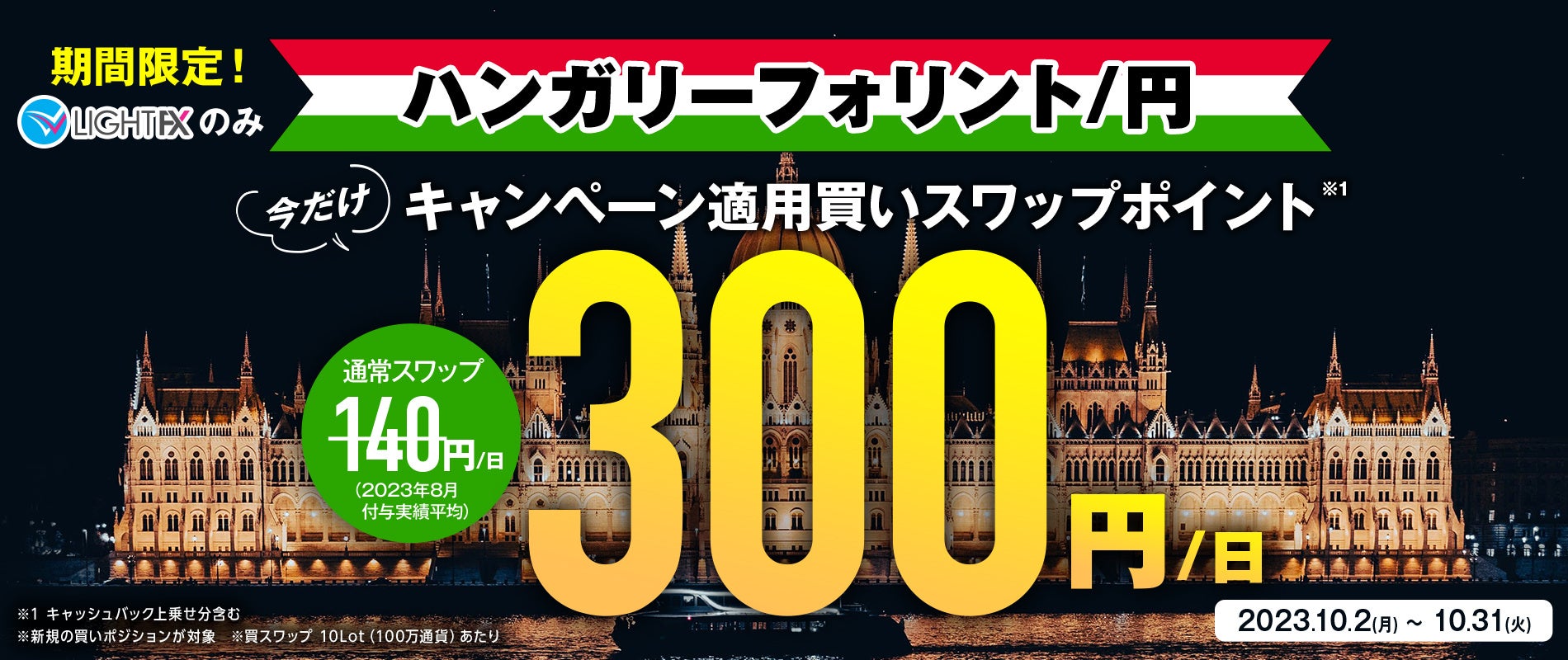 トレイダーズホールディングス株式会社(東京証券取引所スタンダード市場8704)の子会社で、外国為替証拠金取引事業(FX取引)等を営むトレイダーズ証券株式会社(本社:東京都渋谷区、代表取締役:須山 剛、以下「トレイダーズ証券」)は、2023年10月2日(月)より外国為替取引サービス「LIGHT FX」において、「ハンガリーフォリント/円 スワップ300円キャンペーン」を実施いたします。