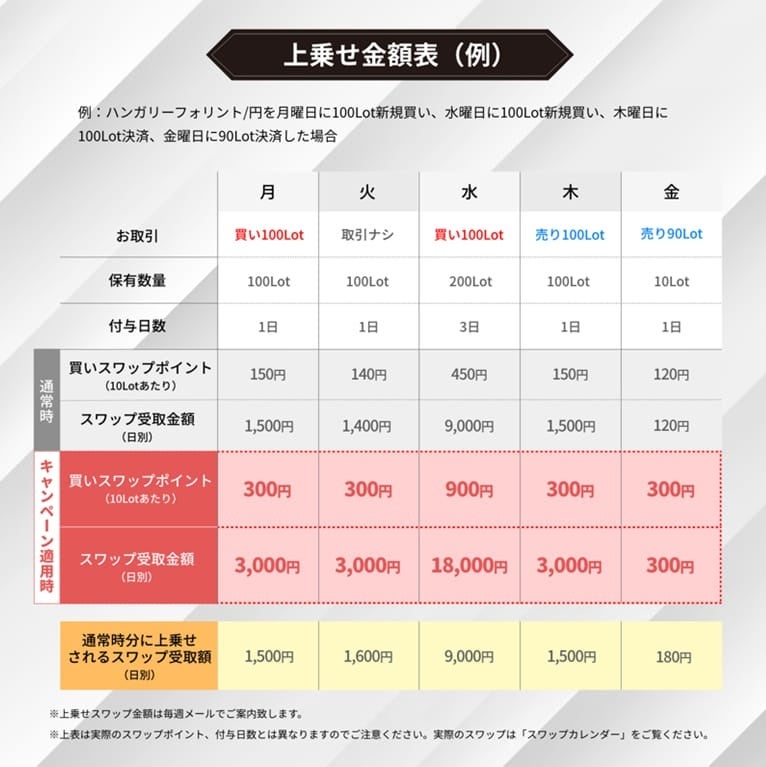 キャンペーン期間中、「LIGHT FX」におけるハンガリーフォリント/円の買いスワップ金額が1日あたり300円(10Lot)になるよう通常のスワップ金額に上乗せしてご提供いたします。