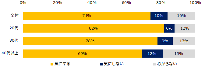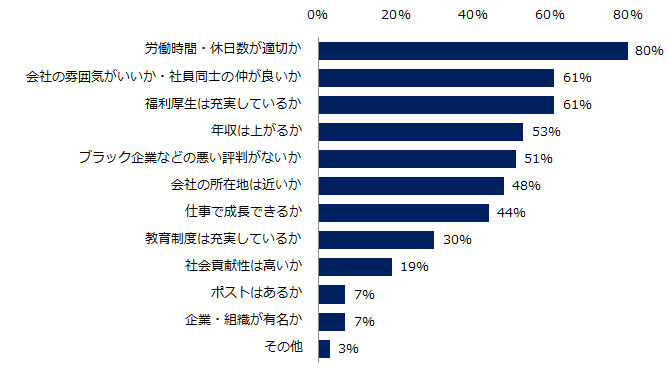 「転職活動の企業選びの際、”ブラック・ゆるブラック・ホワイト”など企業の情報や評判を気にしますか?」と質問すると、74%が「気にする」と回答しました。年代別では、20代が82%と、気にする方が最も多いことが分かりました(30代:78%、40代以上:69%)。評判を気にすると回答した方に、情報や評判の探し方を質問すると、最多は「会社クチコミサイトを見る」(85%)でした。また、転職活動の企業選びの際、気にする条件を伺うと、最多は「労働時間・休日数が適切か」(80%)でした。