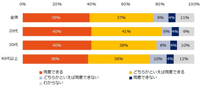 続いて「”ゆるブラック企業だから”という理由での転職を、あなたはどう思いますか?」と質問すると、「同意できる」と回答した方は76%(同意できる:39%、どちらかと言えば同意できる:37%)でした。年代別で見ると「同意できる」の割合は年代が低いほうが高いことが分かりました。(20代:81%、30代:78%、40代以上:74%)。
