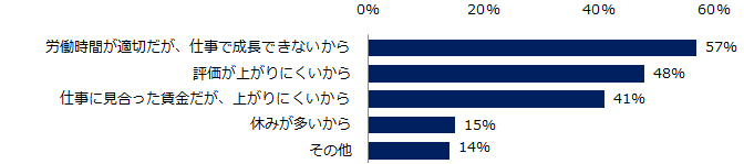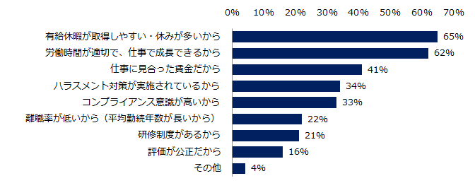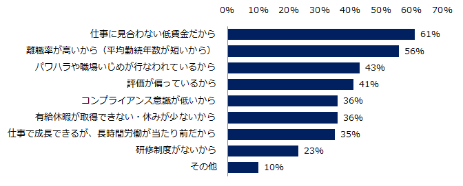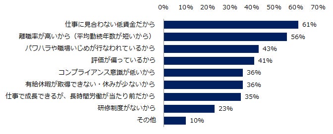 現職の印象を「ブラック企業」と回答した方に理由を伺うと、トップは「仕事に見合わない低賃金だから」(61%)でした。「ゆるブラック企業」と回答した方の理由は「労働時間が適切だが、仕事で成長できないから」(57%)、「ホワイト企業」と回答した方の理由は「有給休暇が取得しやすい・休みが多いから」(65%)がそれぞれトップでした。