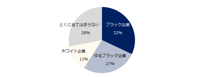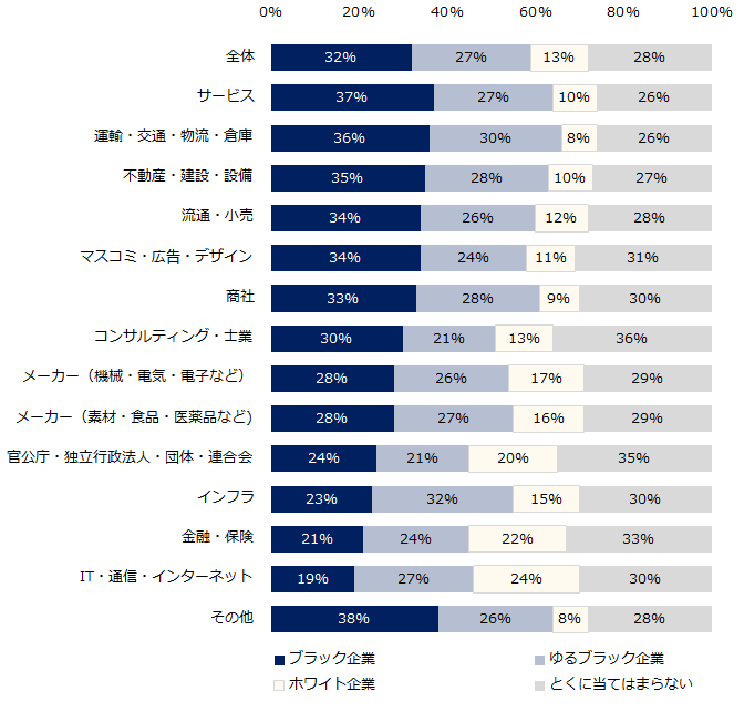 「あなたが勤めている企業は、ブラック・ゆるブラック・ホワイトのいずれに当てはまると思いますか?」と質問すると「ブラック企業」は32%、「ゆるブラック企業」は27%、「ホワイト企業」は13%でした。業種別で見ると、ブラック企業の回答割合が最も高かったのは「サービス」(37%)で、ゆるブラック企業は「インフラ」(32%)、ホワイト企業は「IT・通信・インターネット」(24%)でした。