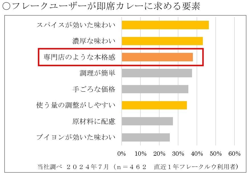 また、カレーフレークを使用されているお客さまは、即席カレーに対して、「専門店のような本格感」を求めており、自分では作れない、外食のようなクオリティの味わいに期待があります。