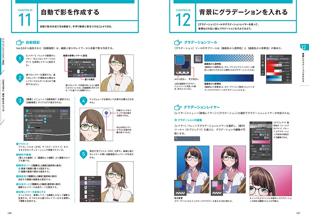 本書は2018年発行の「CLIP STUDIO PAINT PRO 公式ガイドブック」を改訂したもので、2023年にリリースしたCLIP STUDIO PAINT バージョン2.0で搭載された様々な新機能も解説しています。バージョン2.0では頭部や手を描く際に参照できる3D機能の強化や、自動で影を生成する自動陰影、よりリアルな混色を実現するブラシ混色など、CLIP STUDIO PAINTならではのデジタルペイントが楽しめます。