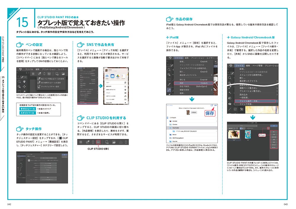 本書では、基本的な使い方はもちろん、線画や彩色技法、合成モードの効果的な使い方、加工方法など、プロに迫る実践的なテクニックが多数掲載されています。また、マンガ制作のためのツールやアニメーション機能のほか、シームレスなパターン、ロゴの作例など、デザインワークで役立つテクニックも盛り込まれています。作例データをダウンロードし、レイヤー構造や設定を紙面と照らし合わせることもできます。さらに、タブレット版(iPad/Galaxy/Chromebook)、スマートフォン版(iPhone/Galaxy/Android)、の操作も紹介されています。CLIP STUDIO PAINT PROの多彩な機能を使いこなして、もっと自由に創作できる、エントリーユーザー必携の入門書です。