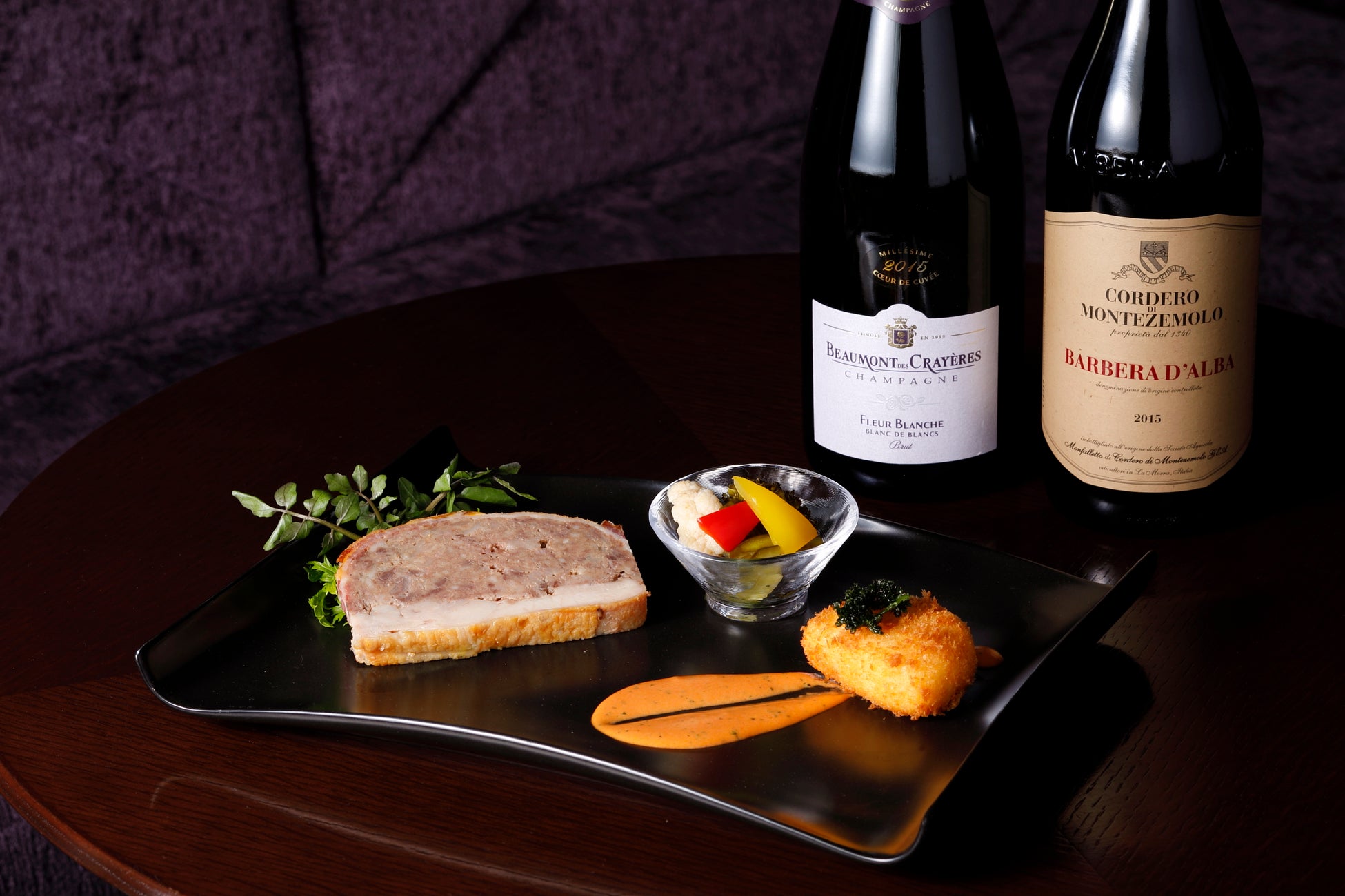 鶏もも肉と和牛ハンバーグを重ねて仕立てた肉料理「アルザス」とパーラーの「クロケット」を盛合せた9周年特別オードブルプレートです。