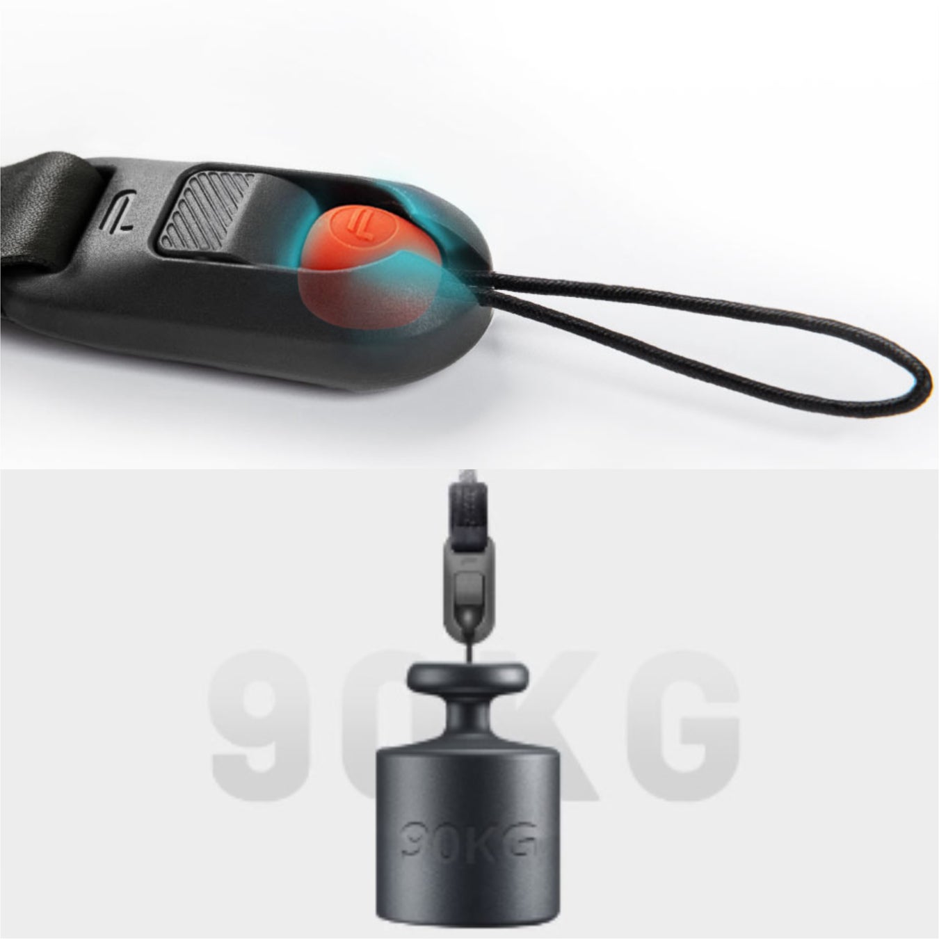 丸く成型されたクイックビーズが、ロックされている状態では全方向から力が加わっても外れる事は無く、ストラップからの脱落を起こしません。また、ストラップ全体で最大90kgの耐荷重に対応します。