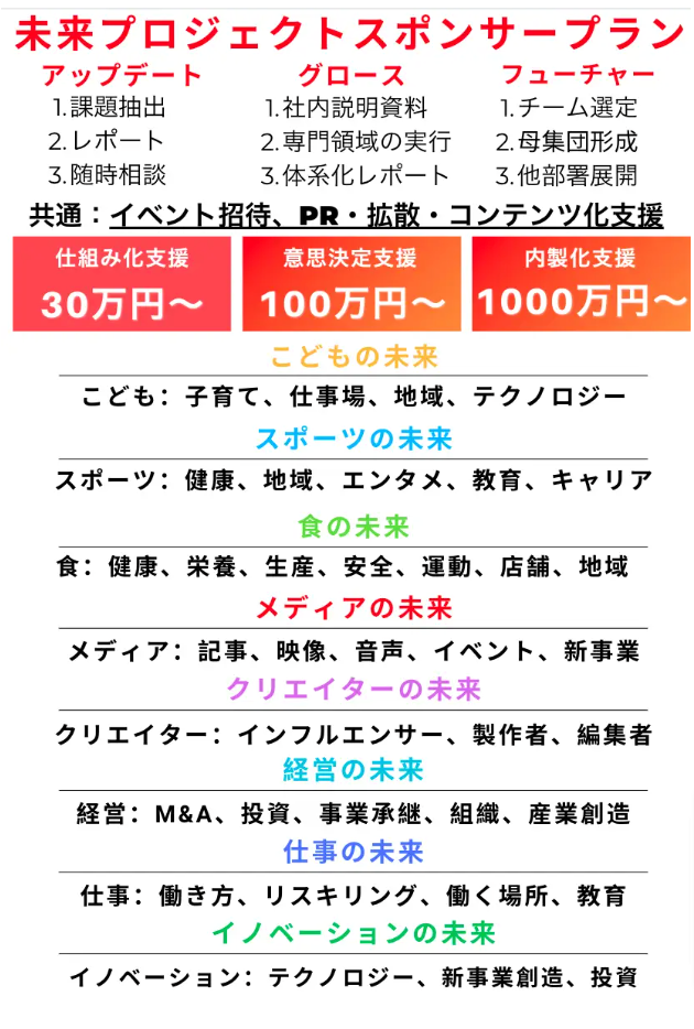 また、未来プロジェクトは、漫画の未来ラボのスポンサーやパートナーとしての参加を広く募集しております。この新しい取り組みに共感し、共に新しいマーケティングの地平を開拓していきたい企業や団体の参加を心よりお待ちしております。