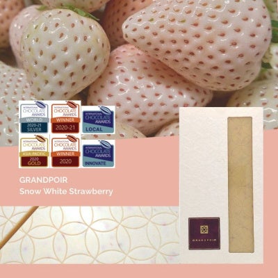 日本で5軒の農家でしか栽培されていない、佐賀県唐津産の希少品種「雪うさぎ(白いちご)」で作った、白砂糖不使用・無添加のフルーツクーベルチュールクラフトチョコレートです。インターナショナルチョコレートアワードにおいて2年連続の受賞実績があり、世界に認められた逸品です。