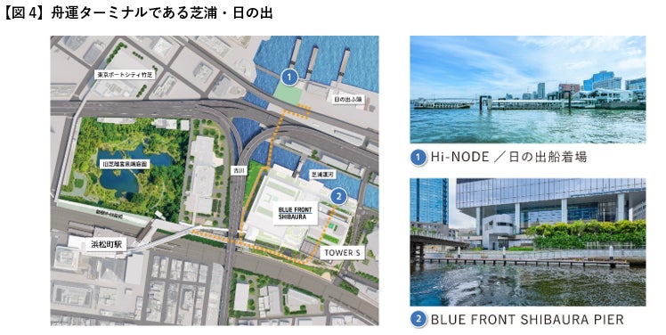 本プロジェクトにおける舟運ネットワークの取組として、2019 年に整備した日の出ふ頭小型船ターミナル「Hi-NODE」を運営しており、またTOWER S の開業と共に新たに芝浦運河沿いに整備する船着場「BLUE FRONT SHIBAURA PIER 」(以下、「本桟橋」)の運営を予定しております。また、野村不動産㈱は2024 年5 月より東京都が推進する舟運活性化の取り組みのひとつである舟旅通勤※3 の実装に向けた補助制度に参画し、晴海〜芝浦・日の出区間における舟運サービス「BLUE FERRY」※4(以下、「本運航」)の運航を開始しております。