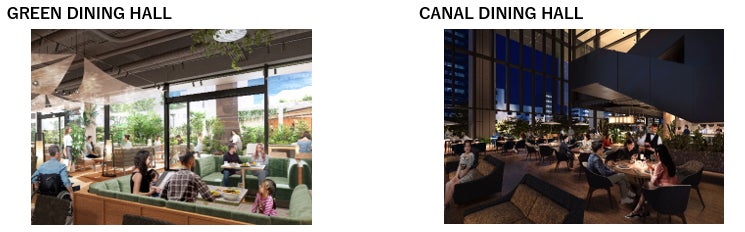 TOWER S の1階から3階までの低層階の商業エリアは、合計専有面積約1,000 坪・29 店舗で構成され、そのうち約7割は飲食店となります。「水」と「緑」とのつながりを体感できる合計約770 席(屋内約540 席/屋外約230 席)の2 つのダイニングホールを中心に、このまちで暮らすオフィスユーザーや地域の皆さまに朝から晩まで様々なシーンでご利用いただけます。ダイニングホールというひらかれた商業エリアが開業し、「まちのコミュニティハブ」としての役割を担い、東京の水辺に新たな賑わいを創出していきます。