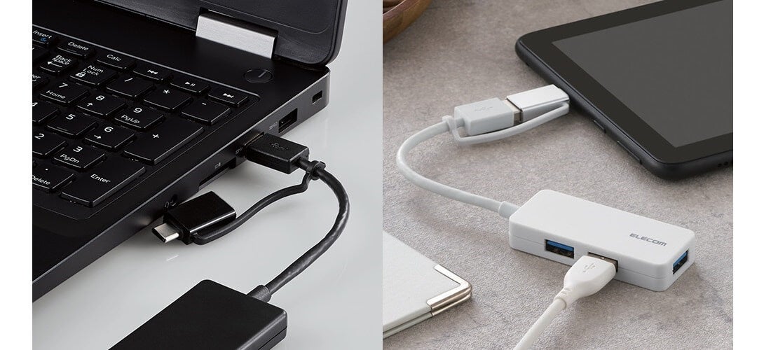 接続元が違う機器でUSBハブを使用したい場合にも、変換アダプターを使うことで手軽に兼用できます。