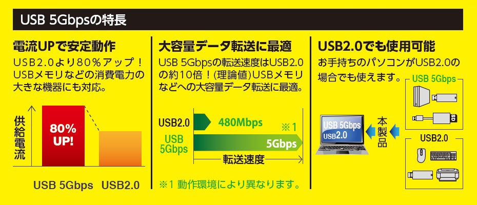 USBハブ本体への給電電流がUSB2.0に比べて80%向上し、複数の機器をつないでも安定した動作が可能です。