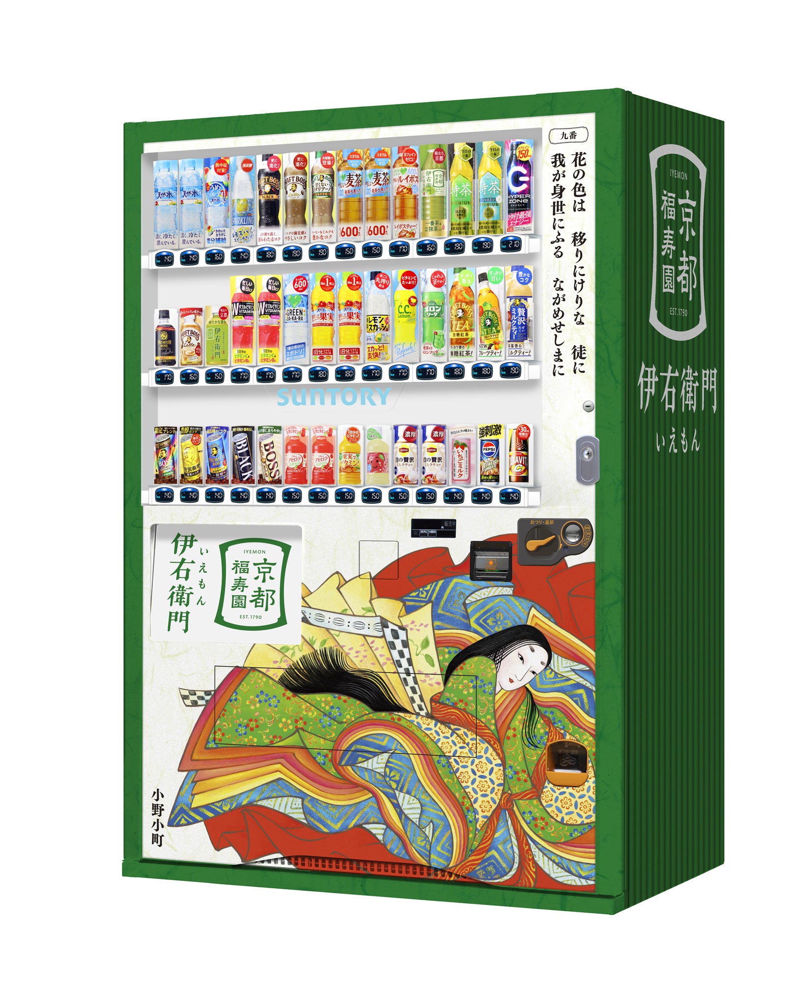 サントリー食品インターナショナル(株)は、“京都”をブランドの原点とするサントリー緑茶「伊右衛門」にて、京都市の協力のもと、京都観光の混雑緩和に向けた取り組みである「巨大かるた自販機を探そう!キャンペーン」を、11月1日(土)~12月14日(日)に実施します。