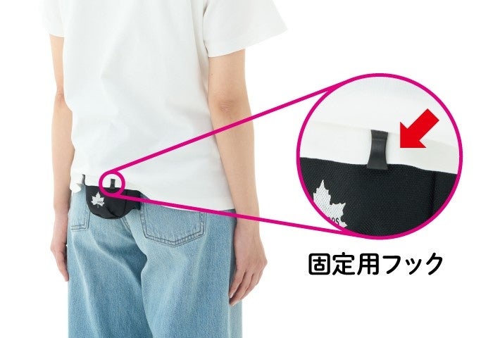 ベルト装着時は、服やレインウェアの裾を固定するフックを使用することで、衣類内への風通りを良くする。
