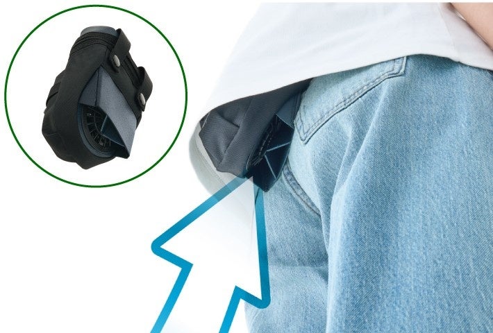 腰に装着して衣類内に送風する、持ち運べるエアコン「ボディエアコン」シリーズから最新型が登場。従来のウエストポーチ型からポーチ型へ進化し、シリーズ最小の手のひらサイズを実現。