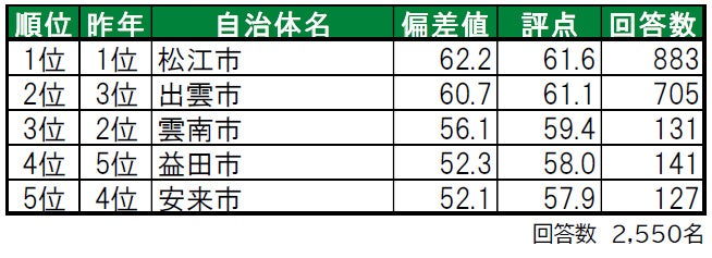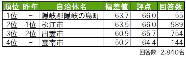 1位は隠岐郡隠岐の島町で、昨年は累計回答数が50名未満だったためランキング集計対象外だった町で、「住みここち」でも3位の高評価を得ています。2位は松江市で、「住みここち」「住み続けたい街」1位、「街に誇りがある」「住みたい街」2位、「街に愛着がある」3位と、全ランキングでトップ3以内に入っています。3位は出雲市で、「街に誇りがある」「街に愛着がある」「住みたい街」1位、「住みここち」「住み続けたい街」2位と各ランキングで高評価を得ています。