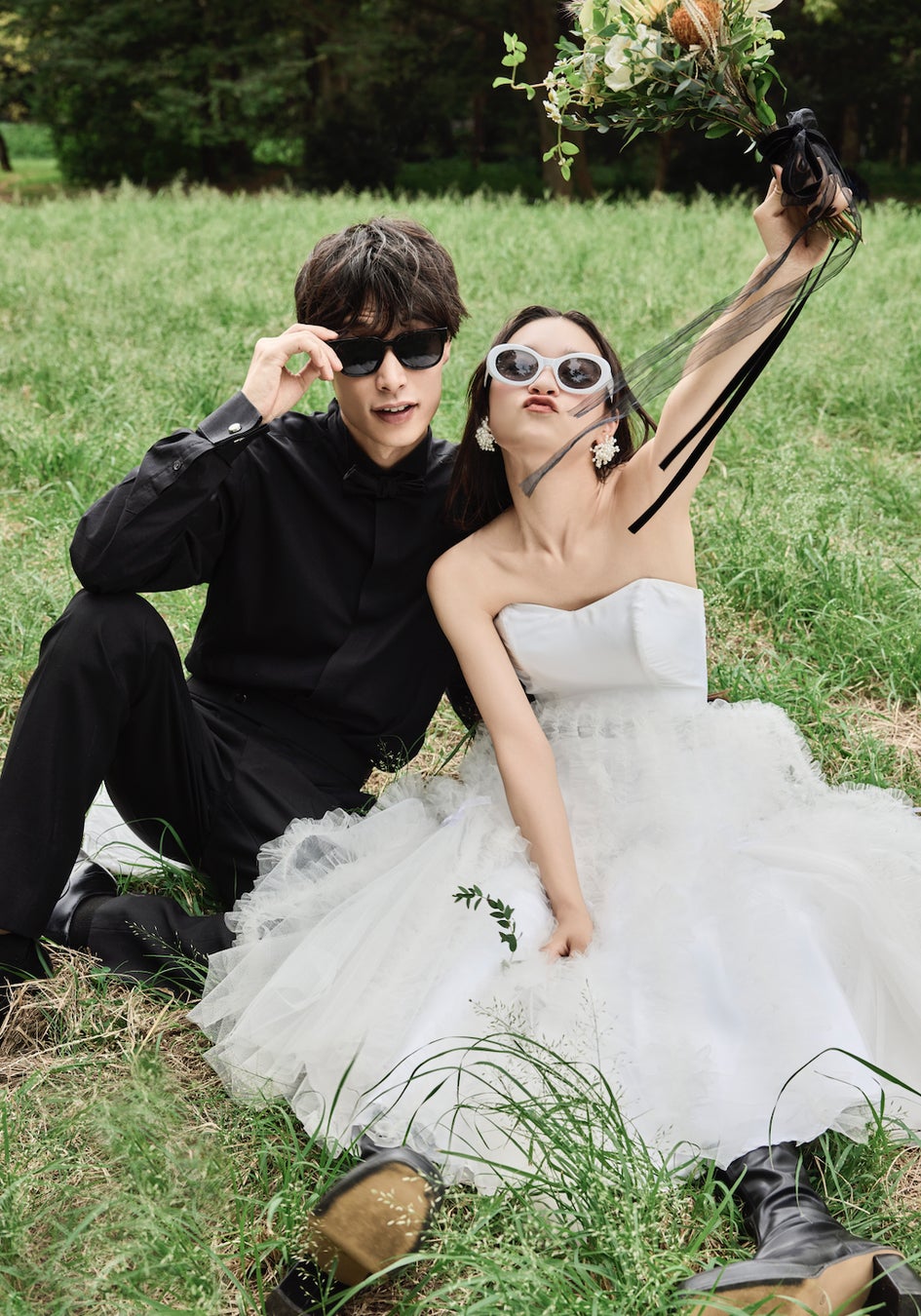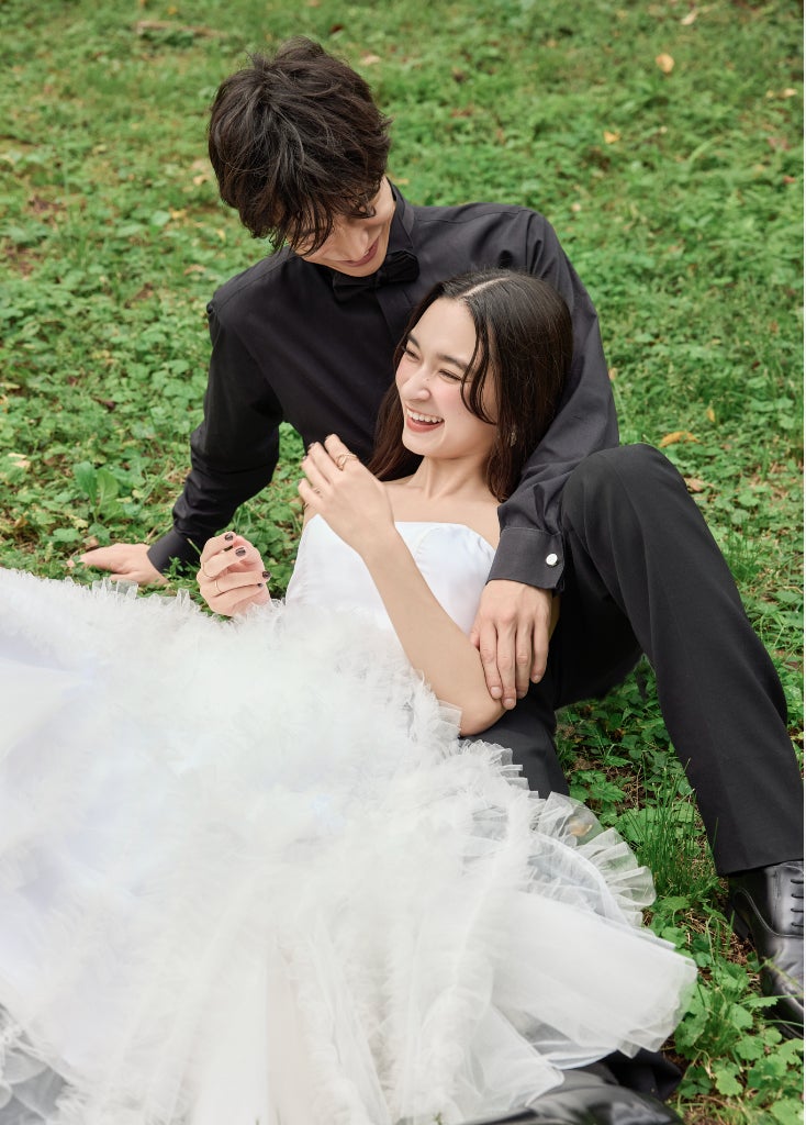 ・芝生の上で笑い合う2人のナチュラルな空気感が溢れる1枚