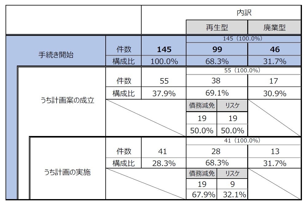 手続きが開始となった145件の進捗について尋ねると、すでに再生計画案が成立したものが55件(構成比37.9%)だった。このうち、計画をすでに実施・完了しているものが41件(同28.3%)だった。