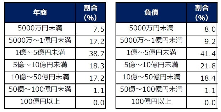 負債規模別にみると、「1億~5億円未満」が41.4%で最多となり、次いで「5億~10億円未満」が21.8%で続いた。年商・負債いずれも「100億円以上」の案件はなかった。